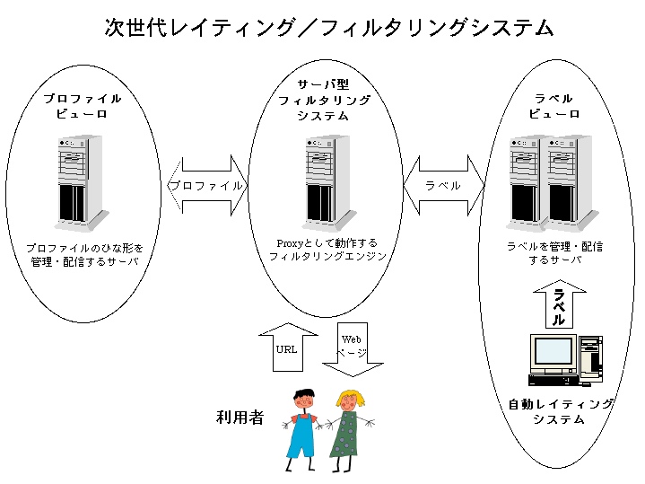 これらを解決し、不適切な情報に対してより実効性のある対応をするために、昨年から、次世代レイティングシステムおよびフィルタリングシステムの開発を実施してきた。このシステムは、当協議会の事務局を務める財団法人ニューメディア開発協会が、通商産業省からの出資を受けて情報処理振興事業協会が実施する「先進的情報システム開発実証事業」の一環として開発したものである。