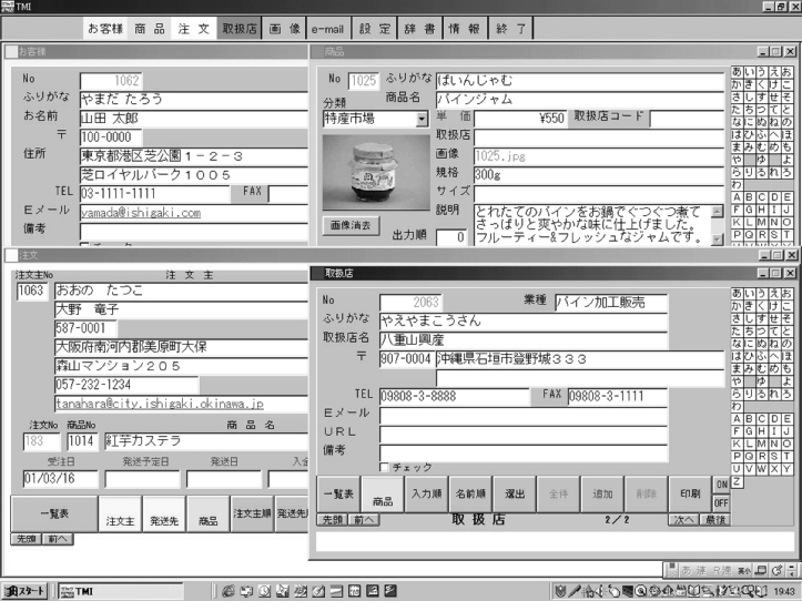 また、インターネットでの販売とはいえ、電話での注文も想定されることから、顧客名の検索や並び替えについても、片手に受話器を持った状態でマウス操作のみで可能なインターフェースとするなど、使い勝手の面でも工夫した。
